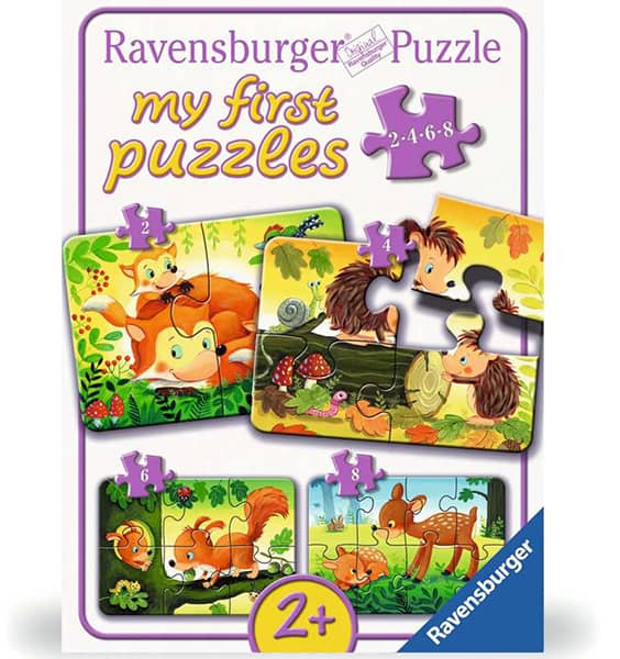 Metsän eläimet lasten palapeli. Pakkauksessa 2, 4, 6 ja 8 palan palapelit. Palapelien kuvissa kettu, siili, orava ja bambi. Valmistaja saksalainen Ravensburger.