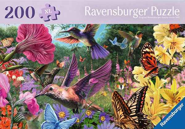 Hummingbirds & Butterflies palapeli 200 palaa on Ravensburgerin aikuisille tarkoitettu palapelattava, jonka koko valmiina on 42,2 x 29,2 cm. Tätä palapeliä voit koota vaikka reissussa tai se sopii hänelle, joka aikuisena haluaa kokeilla palapelien kokoamista. Helppo palapeli aikuiseen makuun. Kuvassa kolibrit ja perhoset lentelevät kukkien ympärillä.