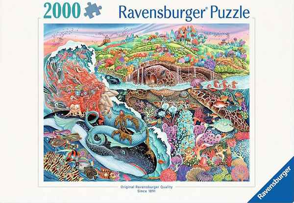 Thalassic Tale palapeli 2000 palaa on Ravensburgerin vuoden 2025 uutuus, jossa vedenalaisessa maailmassa merenneito uiskentelee simpukat hiuksissaan. Värikkäät korallit, kalat, jättiläiskilpikonna ja merihevoset täyttävät veden. Maanpäällinen maailma näyttäytyy kuin satumaailma: tornimaiset talot, puurivistöt ja värikäs taivas.