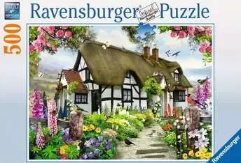 Olkikattoinen talo palapeli (Thatched cottage) on Ravensburgerin 500-palainen, jonka kuvassa englantilainen talo ja ihastuttava, kukkien täyteinen puutarha.