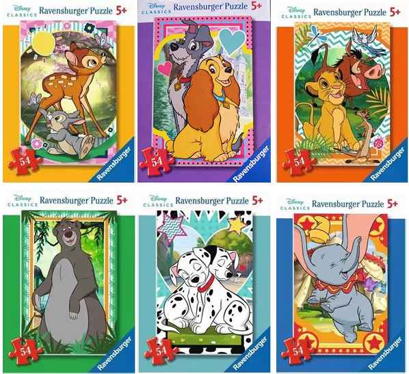 Disney Animals palapeli 54 palaa on Ravensburgerin vuoden 2025 uutuus Disney-palapelisarja, jossa tutut Disneyn hahmot (6 erilaista): Bambi, Leijonakuningas, Viidakkokirjan Baloo-karhu, Kaunotar ja Kulkuri, Dumbo ja 101 dalmatialaista.