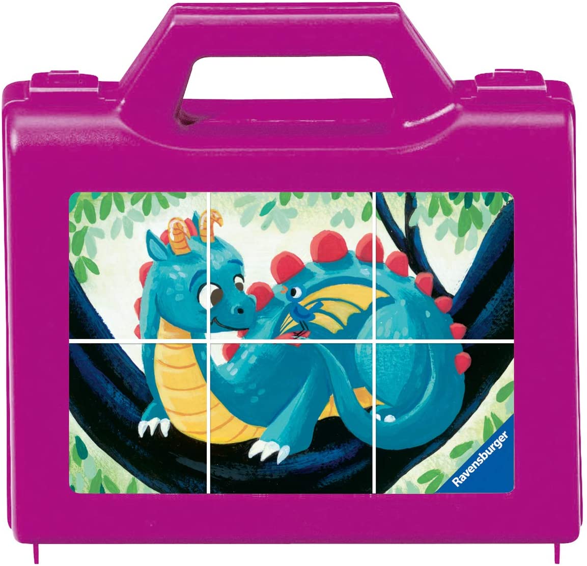 Ravensburgerin kuutiopalapeli muovisalkussa. Kuutioista saa muodostettua kuusi eri kuvaa.