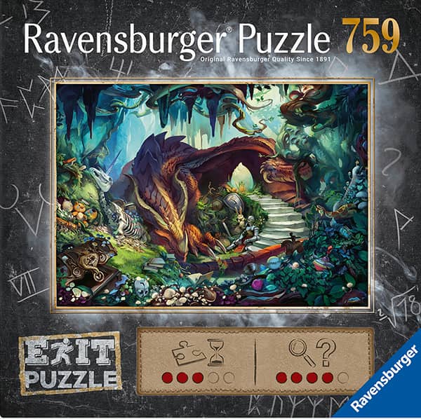 In the dragon’s cave palapeli on Ravensburgerin 759 palan Exit-palapeli, jonka kuvassa lohikäärme ja ritari haarniskassa.