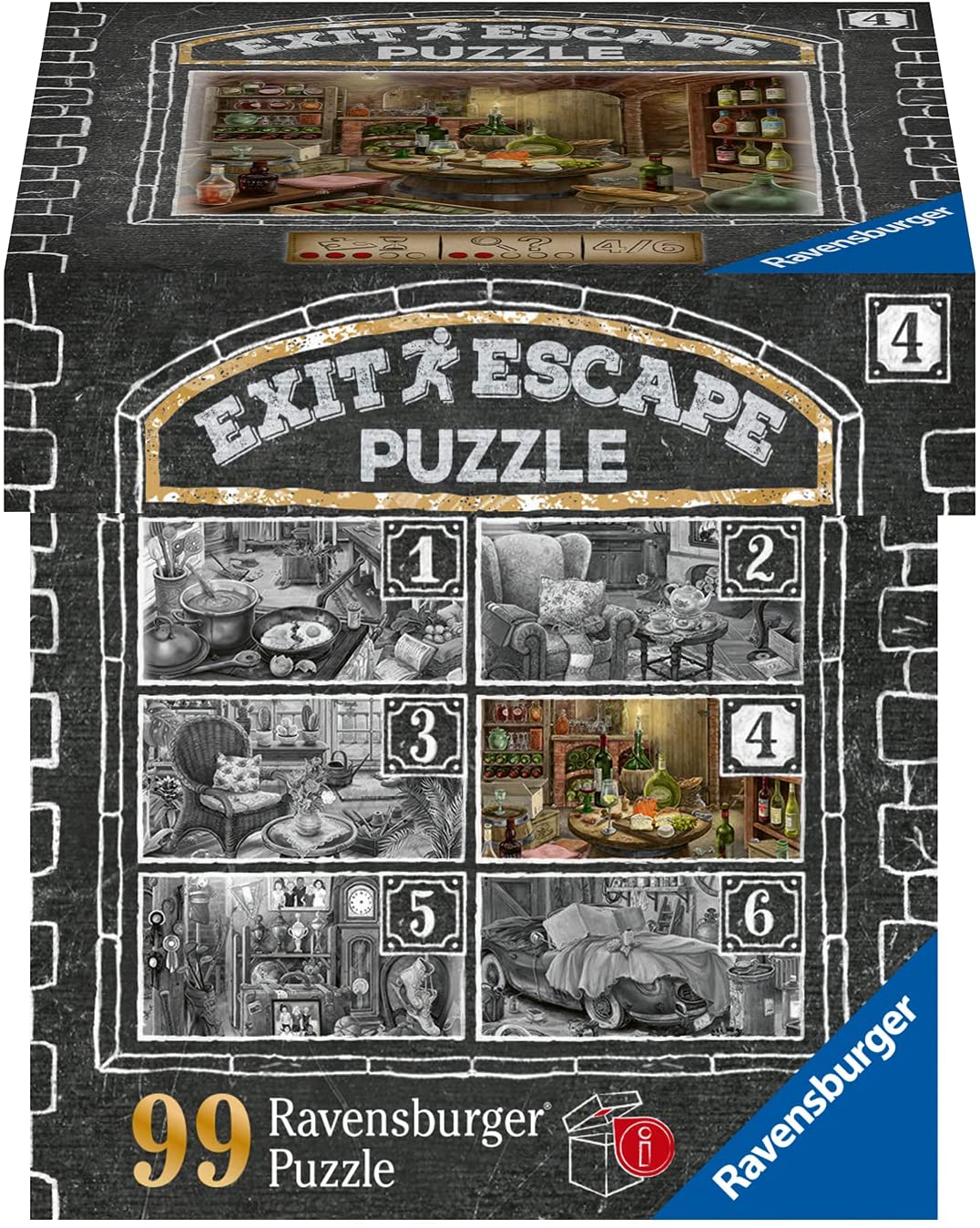 Escape puzzle Wine Cellar 99 palaa on Ravensburgerin pakohuonepalapeli, jonka parissa pääset kokoilemaan Exit-palapeliä pienellä palamäärällä. Kaikki kuusi 99-palaista pakohuonepalapeliä löytyvät samalta alle 500-palaisten sivulta.