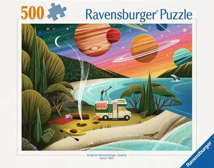 Camp Sight palapeli 500 palaa kutsuu rauhalliseen yöhön luonnon keskelle. Kuvittaja Laura C. Moyerin teoksessa leirielämä yhdistyy tähtitaivaaseen ja kosmisiin yksityiskohtiin: teltta, nuotio ja kaukoputki luovat tunnelman, jossa arki jää taakse.