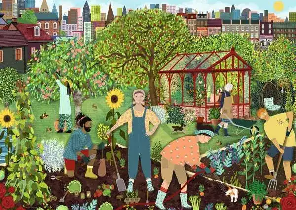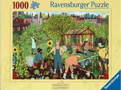 Community Allotment palapeli 1000 palaa on Ravensburgerin tammikuun 2026 uutuus puutarhapalapeli, jonka on kuvittanut Angela Holland! Tämä 1000 palan palapeli vie siirtolapuutarhaan, jossa kasvimaan hoito on ihan parasta puuhaa. Taustalla näkyy kaupunki rakennuksineen.
