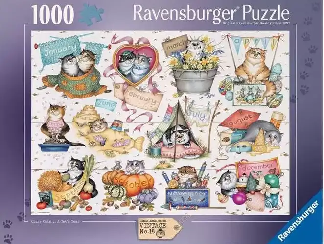 Crazy Cat’s A Cat’s Year palapeli 1000 palaa kuuluu kuvittaja Linda Jane Smith’n Crazy cats -kissapalapelien sarjaan.