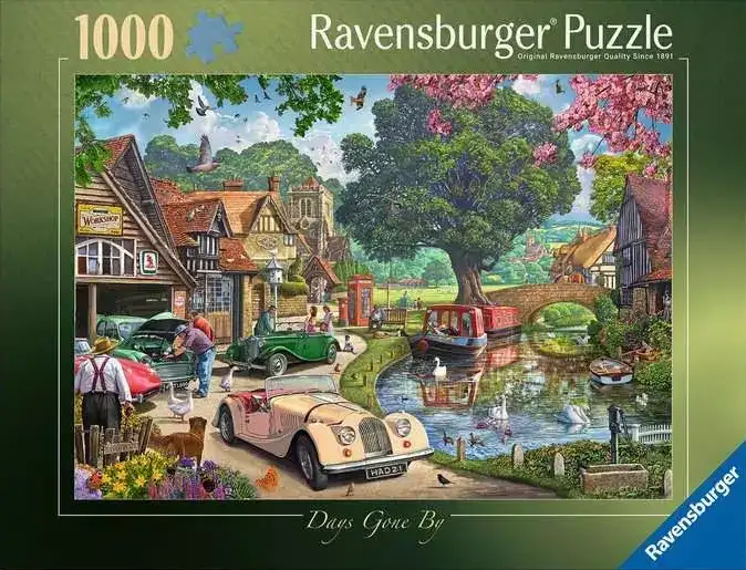 Days Gone By palapeli 1000 palaa on Ravensburgerin nostalgiseen maisemapalapeli, jossa vanhat autot ilahduttavat kylämaisemaa.