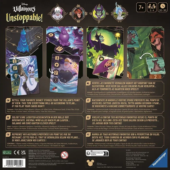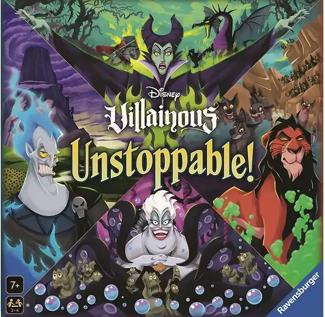 Disney Villainous Unstoppable -lautapeli on hauska pelata ja säännöt ovat helpot. Aloita perhepeli ja astu neljän kuuluisan Disneyn pahisten saappaisiin: Maleficent, Ursula, Hades ja Scar. Seuraa omaa tavoitettasi tullaksesi pahimmaksi kuin kukaan näistä neljästä! Saavuttaaksesi tämän päämärän, käytä erityiskykyjäsi taitavasti ja yritä pilata vastustajien suunnitelmat. Pelaa yhtenä Disneyn kuuluisimmista roistoista.