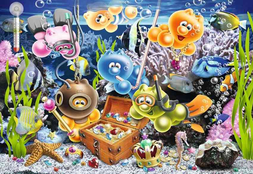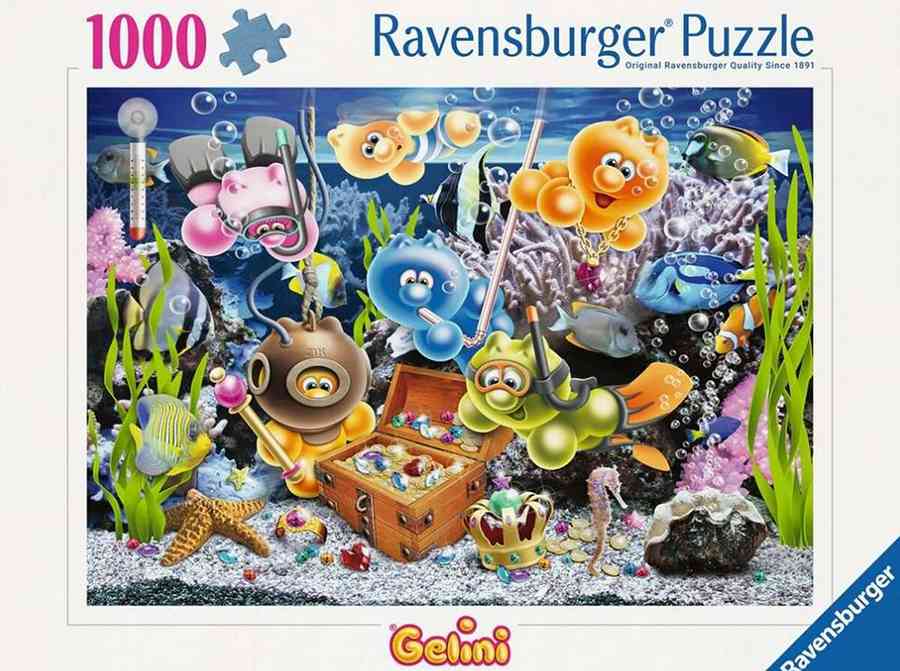 Gelini In Underwater Fun on Ravensburgerin 1000 palan palapeli, jossa seikkaillaan värikkäässä Gelini‑hahmojen vedenalaisessa maailmassa.
