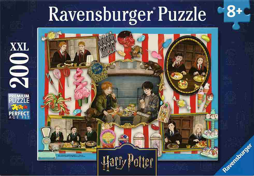 Harry Potter Magical Sweets palapeli 200 palaa on tavallista isommilla palaloilla. Isompia paloja on helpompi käsitellä ja valmiista palapelistä tulee 49 x 36 cm eli noin 500 palan palapelin kokoinen.
