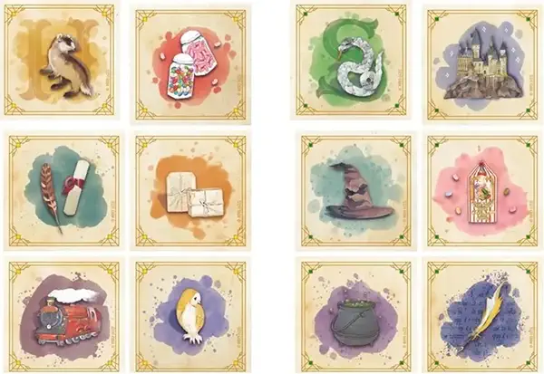 Muistipelin korteissa on tuttuja hahmoja ja henkilöitä Harry Potterista. Muistipelissä on 48 korttia.