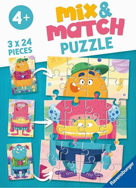 Mix & Match Monsters on Ravensburgerin lasten palapelisetti, jonka kolmessa palapelissä on 24 palaa. Helppo palapeli innostaa lasta kokeilemaan paloja paikoilleen leikin kautta.