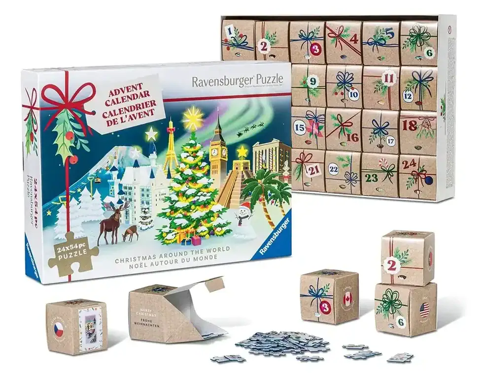 Ravensburger palapelijoulukalenteri 2025 Sarina Jödicken kuvittama. Joulukalenteri on mitä ihanin tapa odottaa joulua kun voit avata joka päivä luukun ja tehdä 54 palan palapelin. Ravensburger Puzzle Advent Calendar on teemaltaan joulu ympäri maailmaa. Jokainen palapeli on jostain kaupungista, maasta tai nähtävyydestä koristautuneena jouluun.