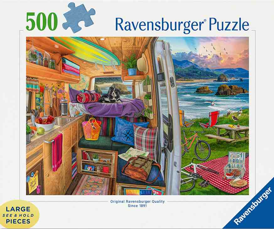 Rig Views palapeli on Ravensburgerin 500 palan Large Format ‑palapeli, jossa katsoja on matkailuauton sisältä avautuvan maiseman äärellä.