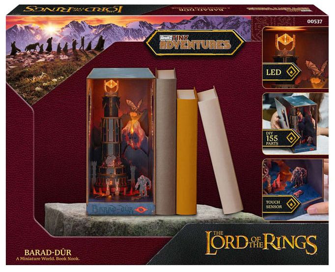 Revellen 3D The Lord of the Rings Barad-Dûr on kirjahyllyyn kirjojen väliin asetettava kirjan kokoinen pienoismaailma.