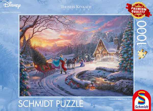 Cinderella Bringing Home the Tree palapeli 1000 palaa on Thomas Kinkade Studiosin kuvittama. Kuvassa Tuhkimo on tuonut kuuden reessä.
