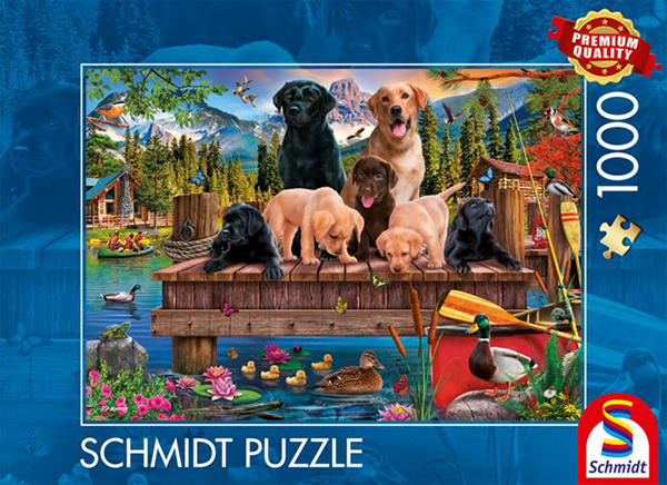 A family of dogs at the lake palapeli 1000 palaa on ihastuttava koirapalapeli. Kesäinen tuulahdus järveltä, koirat ja perheonnesta nauttivat sorsat.
