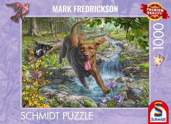 Springtime cavorting with a labrador retriever palapeli 1000 palaa on Schmidtin valmistama maisemapalapeli, jossa ruskea labradorinnoutaja juoksee metsämaisemassa. Palapeli kuuluu Schmidtin Amazing dogs -sarjaan.