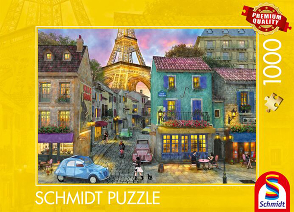 The streets of Paris palapeli 1000 palaa on Dominic Davisonin kuvittama Pariisi-palapeli. Ilta laskeutuu Pariisiin ja ihmiset istuvat kahviloissa. Kivetyille kaduille on jätetty parkkiin rättisitikat ja Eiffel-torni näkyy taustalla.