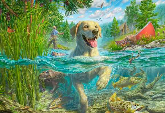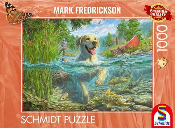 Yellow Labrador goes fishing palapeli 1000 palaa on Schmidtin valmistama maisemapalapeli, jossa keltainen labradorinnoutaja ui. Isäntä kalastaa rannalla. Kuvittaja Mark Fredrickson on kuvittanut koiran liikkeet, veden aaltoilun ja vedenalaisen maailman todella tarkasti. Palapeli kuuluu Schmidtin Amazing dogs -sarjaan.