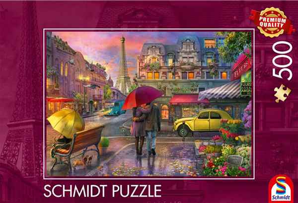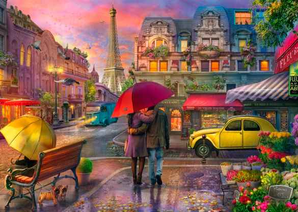 Parisian charm in the rain palapeli 500 palaa on katunäkymä kohti Eiffel-tornia. Pariskunta kävelee sateenvarjon alla.