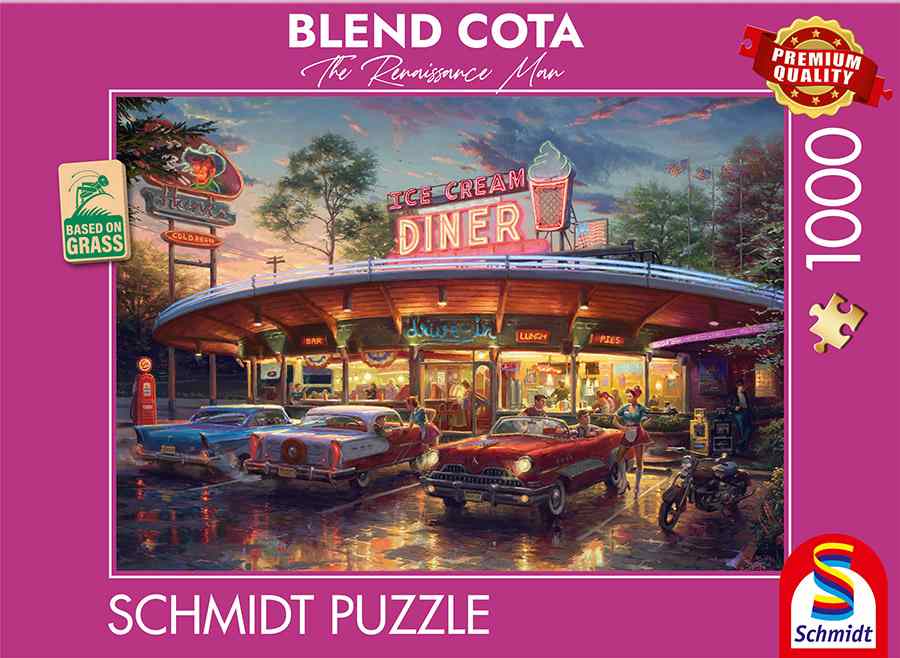 American Diner palapeli 1000 palaa on Blend Cotan kuvittama jenkkiauto-aiheinen kahvilapalapeli. Tämä Schmidt Spielen palapeli on nostalginen matka aikaan, jolloin Cacillacit, Chevroletit, Dodget ja Buickit olivat kahvilan parkkipaikalla vakiokalustoa.