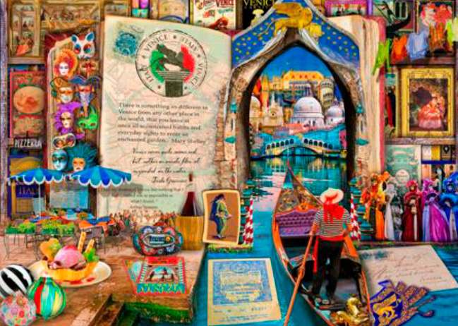 Schmidt Memories of Venice palapeli 1000 palaa on Aimee Stewartin kuvittama Venetsia-palapeli, jossa ihanat Italian väritä ja Venetsiasta tuttuja maisemia ja esineitä. Aimee Stewartin kuvittamaan matkailuaiheiseen sarjaan kuuluu myös Lontoo, New York ja Pariisi.