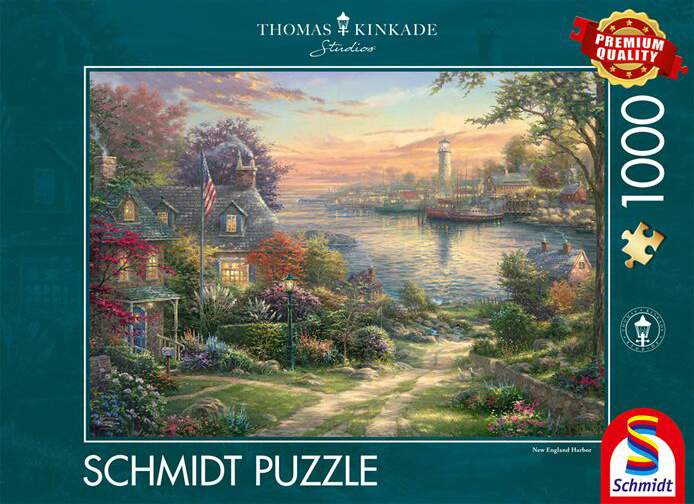 New England Harbour palapeli 1000 palaa on Nanette Kinkaden (Thomas Kinkade Studios) kuvittama satama-aiheinen palapeli.Schmidt New England Harbour palapeli 1000 palaa