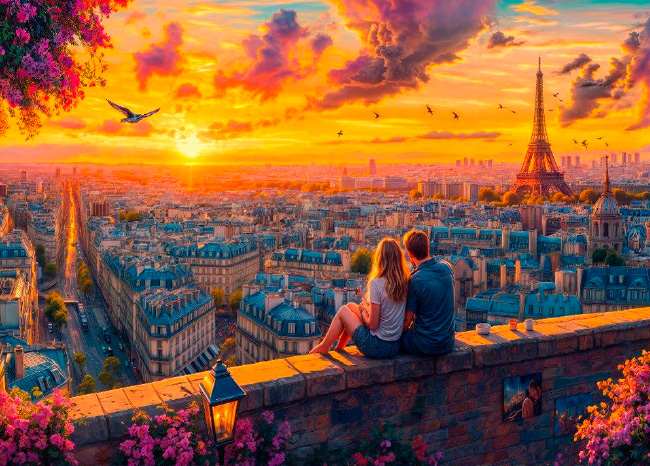 Schmidt Paris rooftop whispers palapeli 1000 palaa on saksalaisen Schmidtin Pariisi-aiheinen palapeli. Kuvassa pariskunta istuu korkealla ja katselee alas Pariisin kaduille. Taivas on värjäytynyt oranssin ja keltaisen sävyihin. Eiffel-torni piirtyy taivasta vasten.