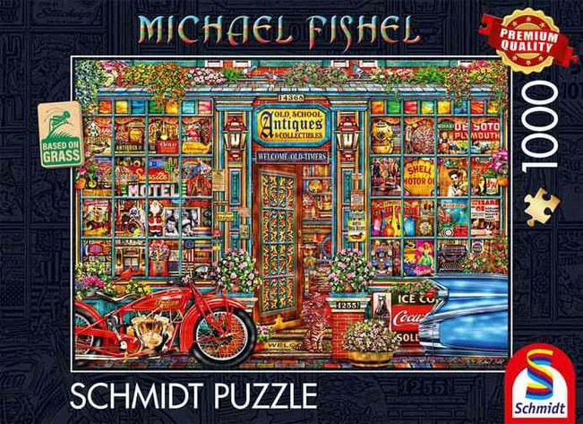 Treasures of the past palapeli 1000 palaa on Schmidt Spielen antiikkikauppa-aiheinen palapeli. Tämän 1000 palan värikkään palapelin on kuvittanut Michael Fishel.