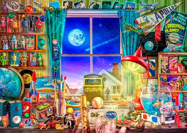 Schmidt Up to the Moon palapeli 1000 palaa on Aimee Stewartin kuvittama huonepalapeli. Kirjoituspöytä on täynnä tavaraa ja hyllyissä komeilee robotit. Kaukoputki on jätetty pöydälle. Liekö kuun tarkkailu jo riitti.