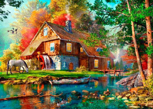 Schmidt Water mill in autumn palapeli 1000 palaa on saksalaisen Schmidtin maisemapalapeli. Kuvassa joen varressa oleva mylly pyörittää vettä. Hevonen laiduntaa syksyisessä maisemassa.