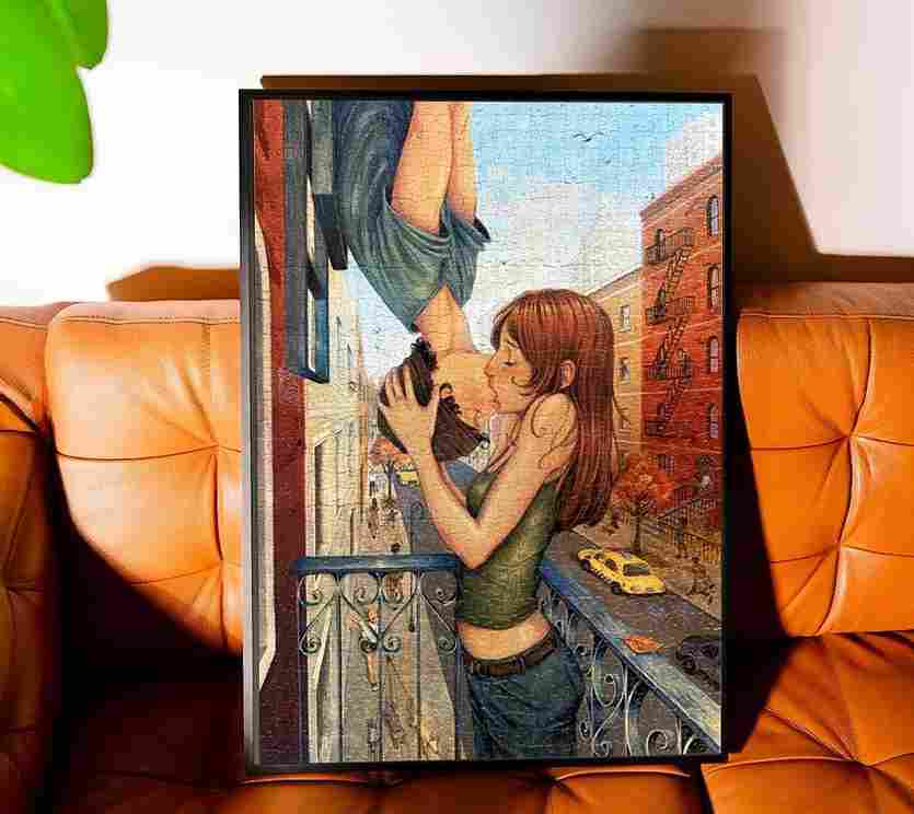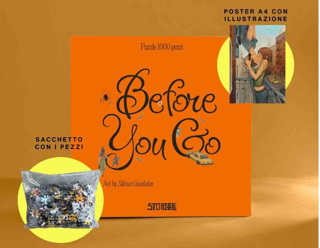 Before You Go on 1000 palan palapeli, joka kuvaa romanttista maisemaa vilkkaassa ja tunnistettavassa New Yorkissa, jolle ovat ominaisia tyypilliset punatiiliset rakennukset kuuluisine ulkoisine paloportaikkoineen. Kuvitus vangitsee pysähtyneen ja elokuvamaisen hetken: parvekkeelle nojaava nuori nainen ojentaa kätensä ylöspäin suudellakseen rakennuksesta ylösalaisin roikkuvaa poikaa. Tämä on selkeä kunnianosoitus Hämähäkkimies-elokuvan kuuluisalle ”ylösalaisin”-suudelmalle, josta on tullut popkulttuurin ikoni.
