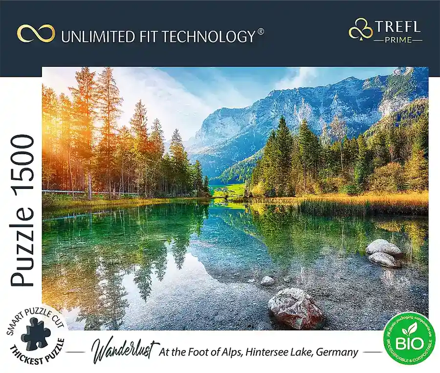 Tämä 1500 palan palapeli At the Foot of Alps, Hintersee-järvi Saksassa on upea alppimaisema, jossa havupuut heijastuu kirkkaaseen veteen.