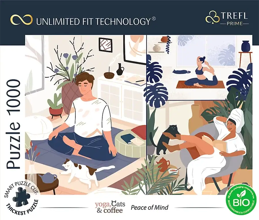 Peace of Mind palapeli 1000 palaa on Trefl Primen jooga, kissat ja kahvi -aiheinen palapeli.