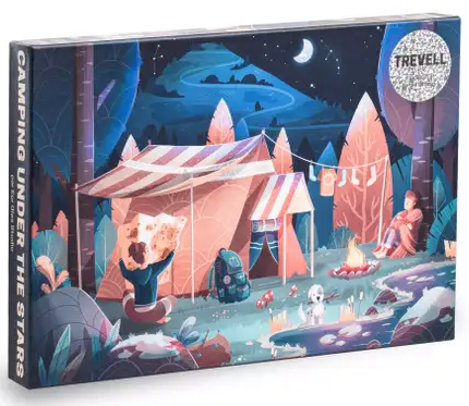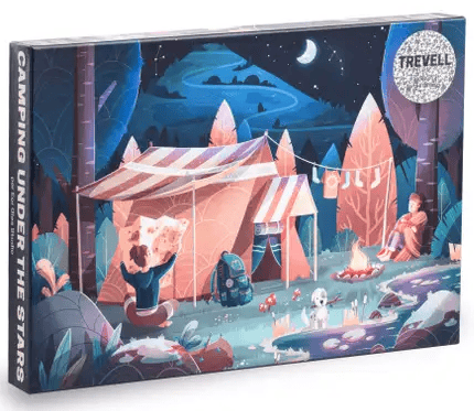 Trevell Camping under the stars palapeli 1000 palaa on ranskalaisen Trevellen valmistama. Retkeilyaiheisen palapelin kuvassa nainen tutkii karttaa, mies lepää puuta vasten ja nautti leirinuotiosta. Teltta on pystytetty ja sukat roikkuu narulla. Päivän vaellus on takana ja on aika levätä.
