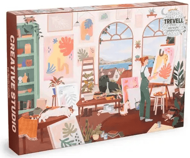 Trevell Creative Studio palapeli 1000 palaa on ranskalaisen Trevellen valmistama. Taidemaalariaiheisen palapelin kuvassa nainen maalaa taulua, kissa katselee vieressä. Värikkäät taulut on ripustettu seinille, osa nojaa seinää vasten. Luonto ja kasvit näyttävät inspiroivan taiteilijaa.