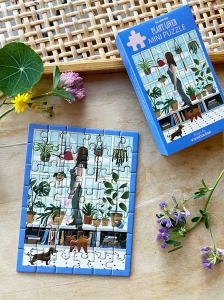 Vissevasse Plant lover -palapeli on 42 palan minipalapeli, jonka kuvassa nainen kastelee viherkasveja.