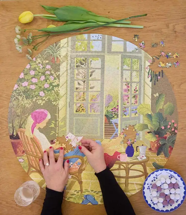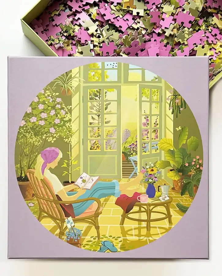 Morning Glow on Vissevassen 1000 palan pyöreä palapeli, joka kuvaa rauhallista aamun hetkeä. Aamuaurinko siivilöityy läpi isojen ikkunoiden kertoen uudesta päivästä. Nostat jalat ylös, lämmin kuppi kahvia ja suosikkikirja kädessä. Levollinen kesäaamun hetki on juuri tässä ja nyt.