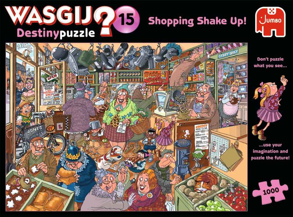 Wasgij Destiny 15 Shopping Shake up -palapeli vie tulevaisuudessa eteenpäin. Eli miltä kannen kuvan tapahtumat näyttävät joskus tulevaisuudessa? Et siis kokoa kannen kuvaa vaan jotain ihan muuta. Wasgij on mukava tapa laittaa aivot hommiin, kokeile vaikka!