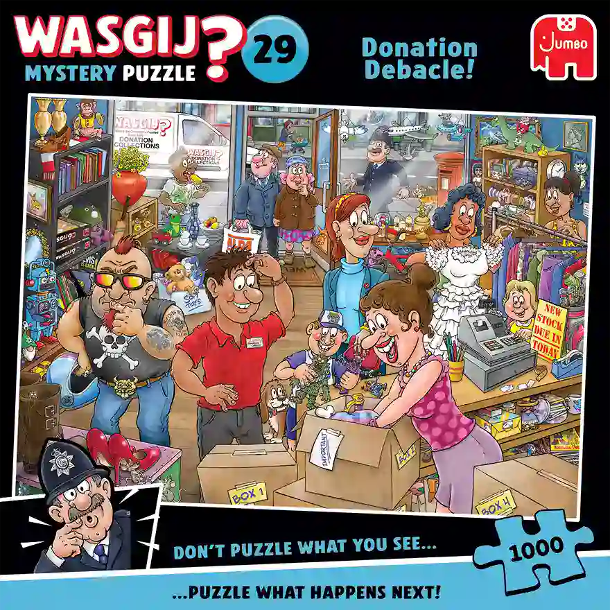 Tervetuloa vilkkaaseen kirpputorin maailmaan, jossa mikään ei ole sitä miltä näyttää! Wasgij Mystery 29: Donation Debacle! -palapelissä et kokoa laatikon kuvaa – vaan sinun täytyy selvittää, mitä tapahtuu seuraavaksi. Käytä mielikuvitustasi ja vihjeitä selvittääksesi, millainen kaaos syntyy uusien lahjoitusten saavuttua.