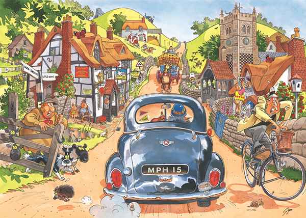 Wasgij Original 1 -palapelilaatikon päällä on kuva, jossa auto ajaa keskellä kylää ja ihmiset kauhistelevat.