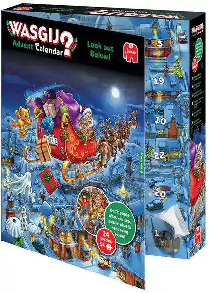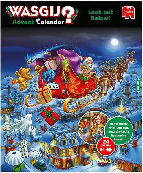 Wasgij palapelijoulukalenteri sisältää 24 minipalapeliä, joissa kussakin on 54 palaa. Wasgij joulukalenteri Look out below on alankomaalaisen Jumbon vuoden 2024 joulukalenteri ja joulupalapeli.
