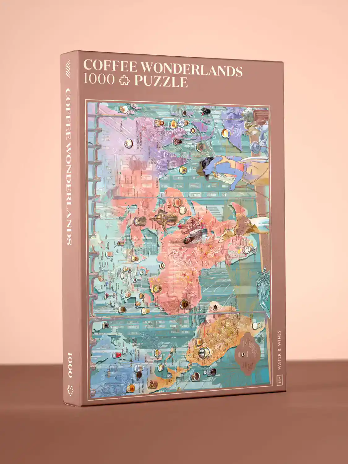 Water & Wines Coffee Wonderlands palapeli 1000 palaa on opetustaulumainen kahvipalapeli, jossa kartta ja siinä tietoa eri kahvilajikkeista. Kahvipalapelin on kuvittanut Nikita Fabbro.