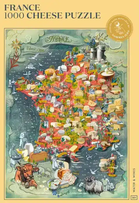 Water & Wines French Cheese palapeli 1000 palaa on opetustaulumainen juustopalapeli, jossa Ranskan kartta ja siinä tietoa juustoista. Juustopalapelin on kuvittanut Sophie Haza.