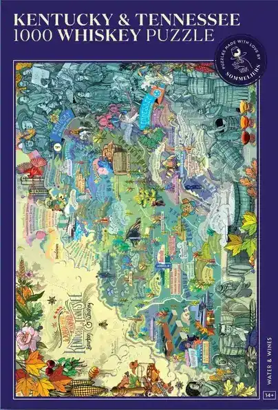 Water&Wines Kentucky & Tennessee Whiskey palapeli 1000 palaa: Tutustu Kentuckyn ja Tennesseen viskien maailmaan tällä upealla viskipalapelillä. Asiantuntijoiden huolella suunnittelema ja käsin kuvitettu palapeli korostaa tärkeimpiä Yhdysvaltojen viskin tuotantoalueita.