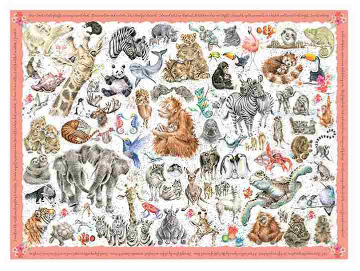 Wrendale Zoology palapeli on Wrendale Designs -sarjan ihastuttava 1000 palan villieläinpalapeli, joka hurmaa yksityiskohdillaan ja suloisella kuvituksellaan. Taiteilija Hannah Dalen akvarellityyliset kuvitukset esittävät yli 100 villieläintä. Mukana on tuttuja eläimiä eläintarhasta kuten kirahvit, norsut, seeprat, kengurut, susi, kilpikonnat, linnut, liskot, panda ja esimerkiksi jääkarhu.