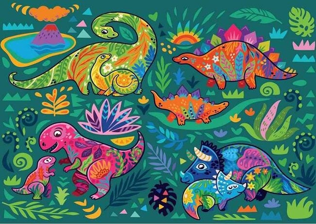 Yazz Dinosaurs palapeli 1000 palaa on värikäs aikuisten dinosaurus-palapeli. Tämän 1000 palan eläinpalapelin voit aloittaa vaikka jostain dinosauruksesta reunapalojen sijaan. Väriä ja yksityiskohtia riittää, mikä helpottaa kokoamista.